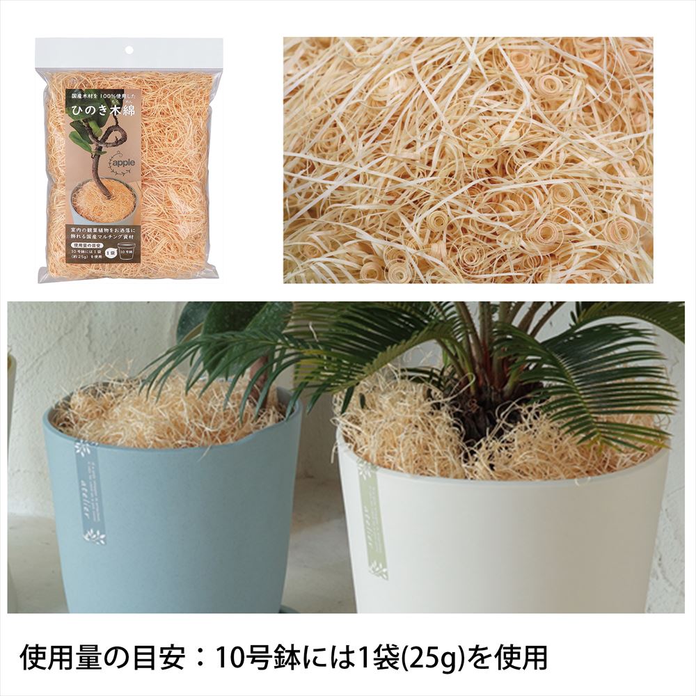 ひのき木綿期間限定企画品HM25G ●植物を清潔に飾れる、安心・安全な国産ひのき100%のマルチング資材 ●ふかふかだから観葉植物も長持ち 商品詳細 カラーベージュJANコード4905980804135サイズ18.0×5.0×25.0cm使用量の目安10号には1袋材質ひのき